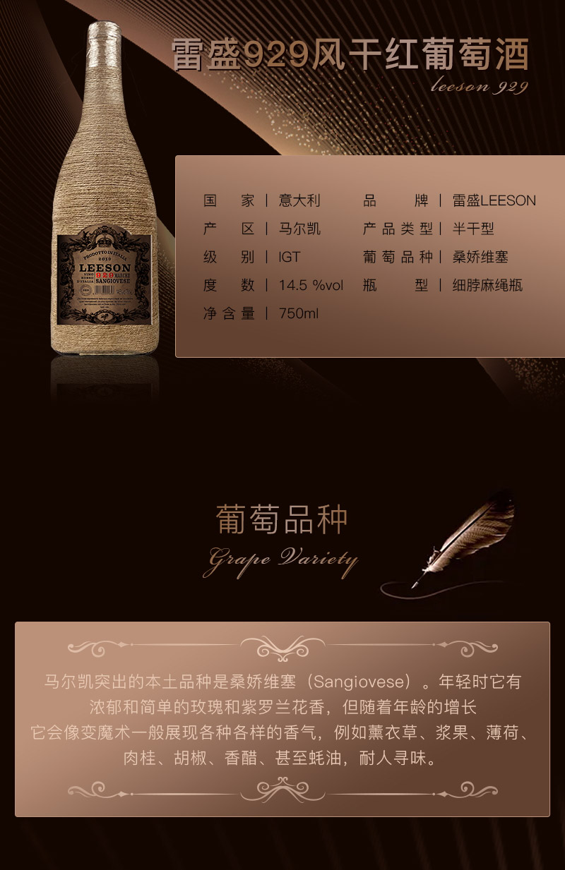 雷盛红酒929意大利干红葡萄酒